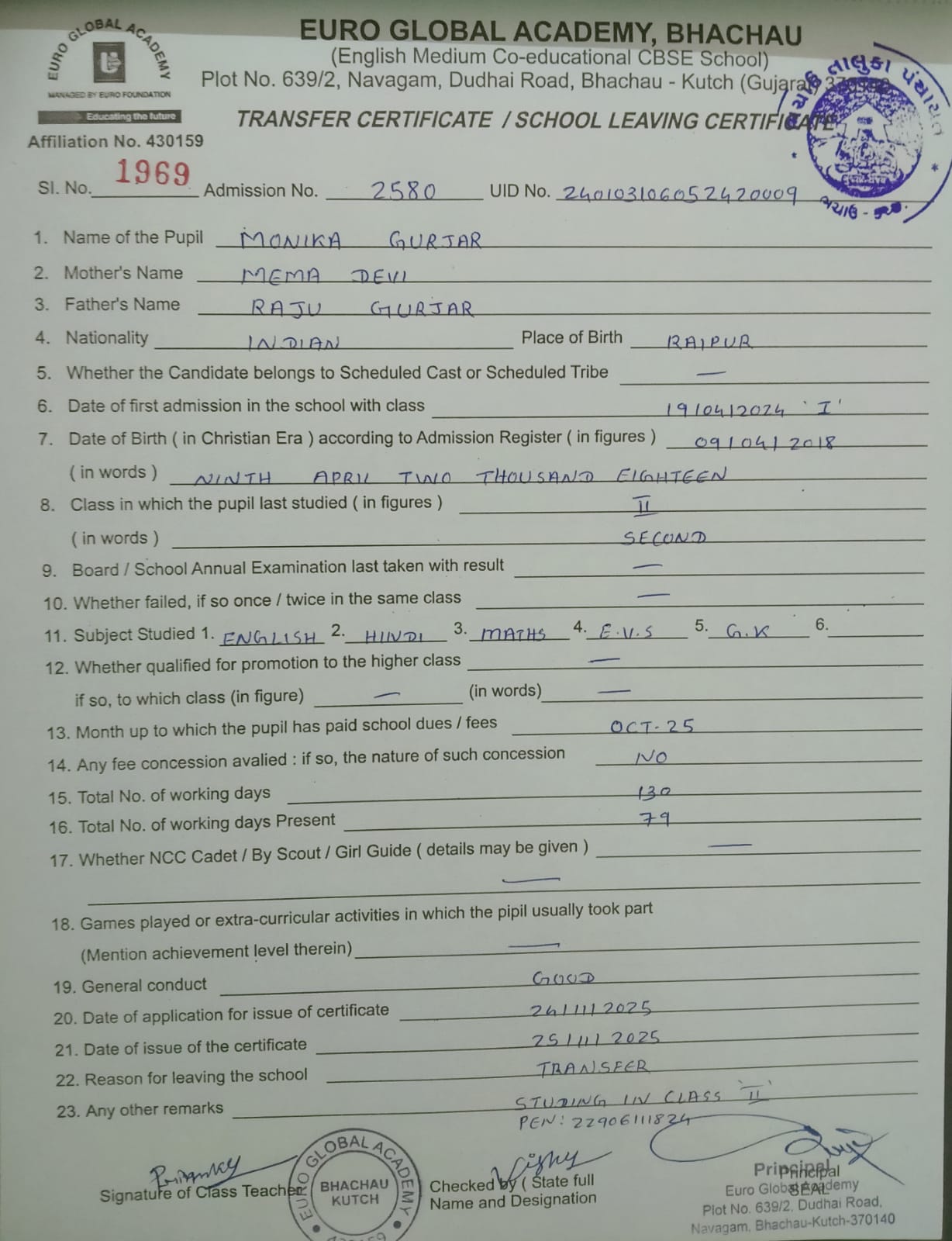 | 1969 | 2580 | MONIKA GURJAR | II | 25/11/2025 | VIEW |
