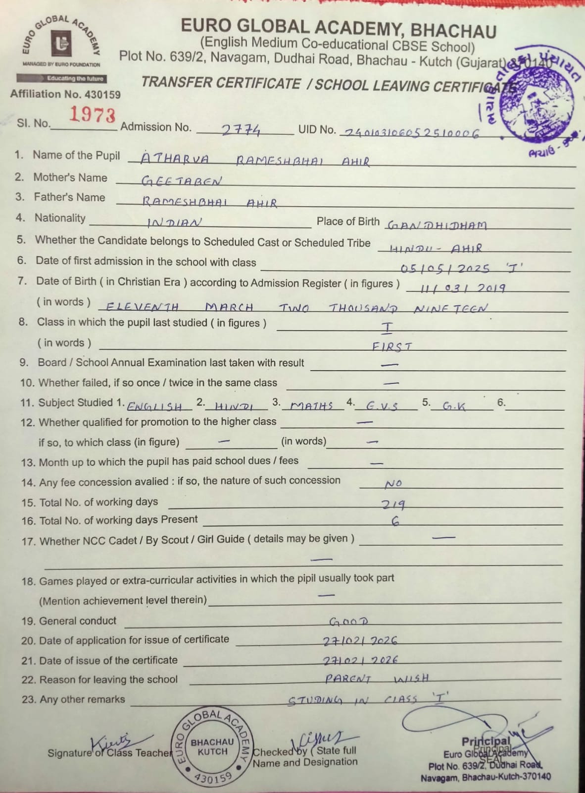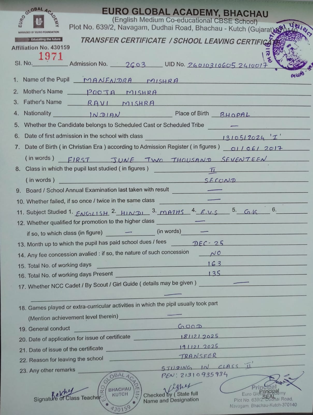 | 1967 | 2633 | RIDDHANSH SANJAYSINGH THAKUR | VII | 6/11/2025 | VIEW |