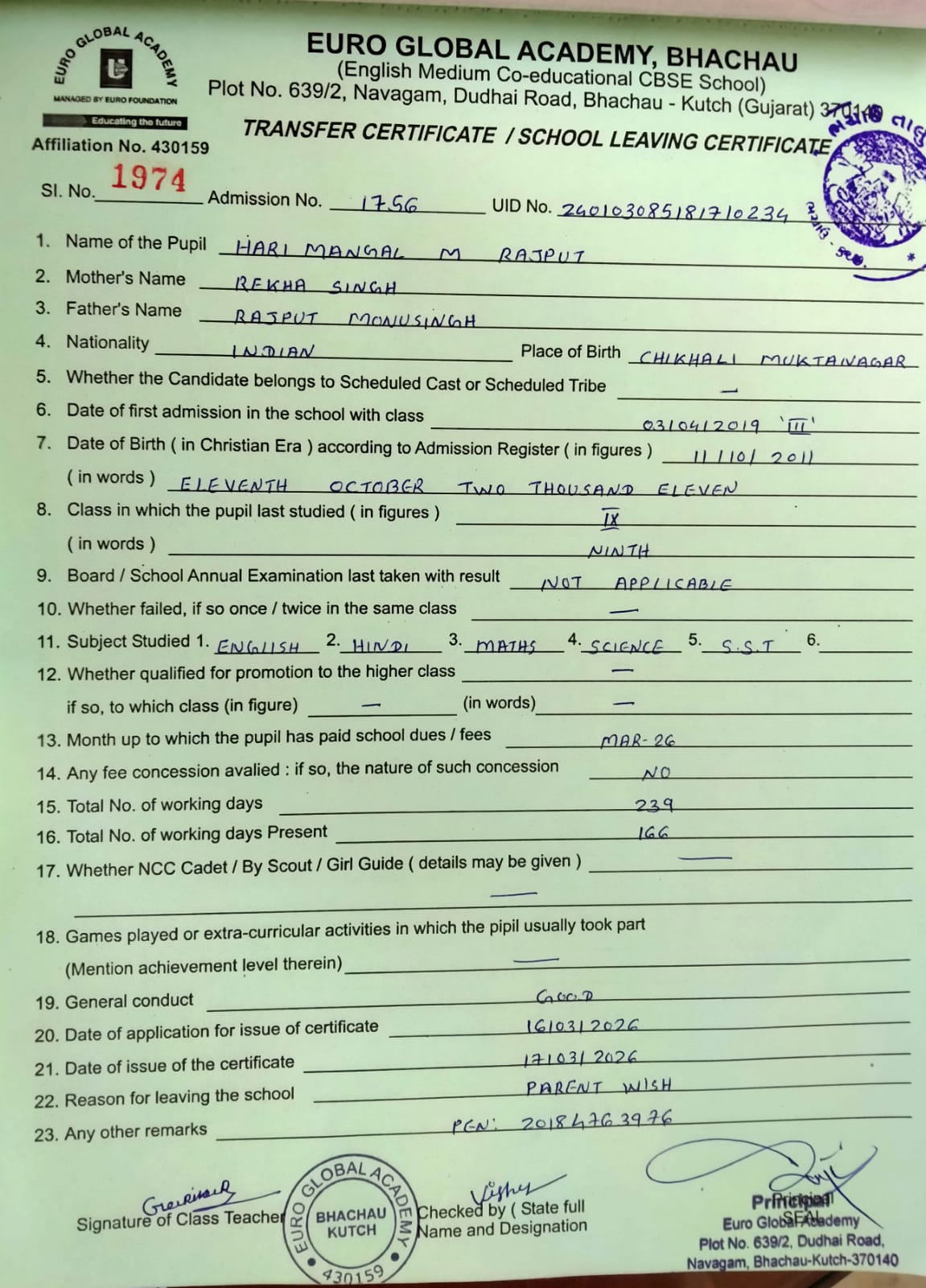 | 1974 | 1756 | HARI MANGAL M RAJPUT | IX | 17/03/2026 | VIEW |