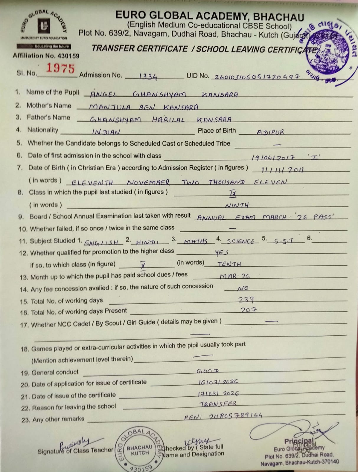 | 1975 | 1334 | ANGEL GHANSHYAM KANSARA | IX | 17/03/2026 | VIEW |