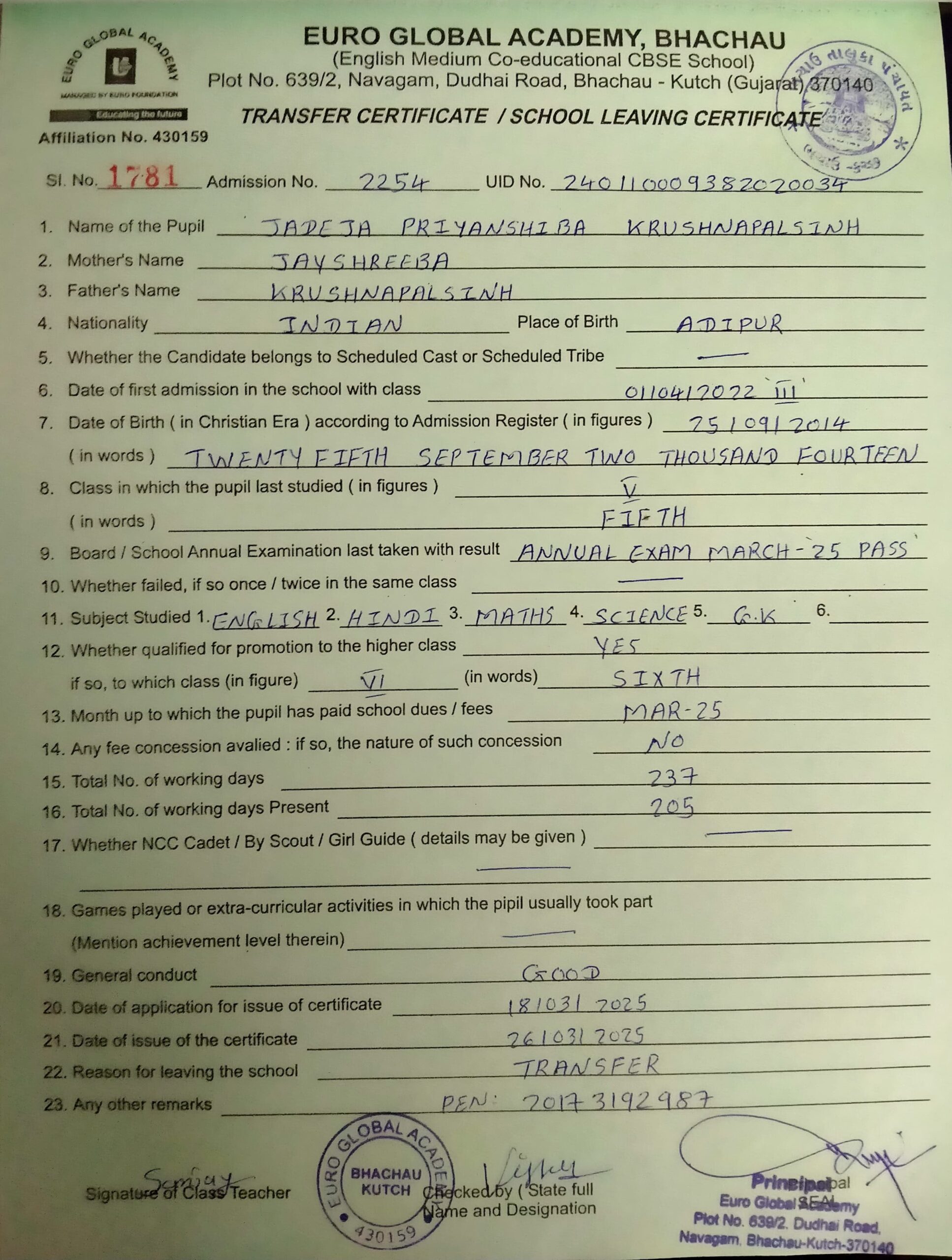 | 1781 | 2254 | JADEJA PRIYANSHIBA K | V | 26/03/2025 | VIEW |