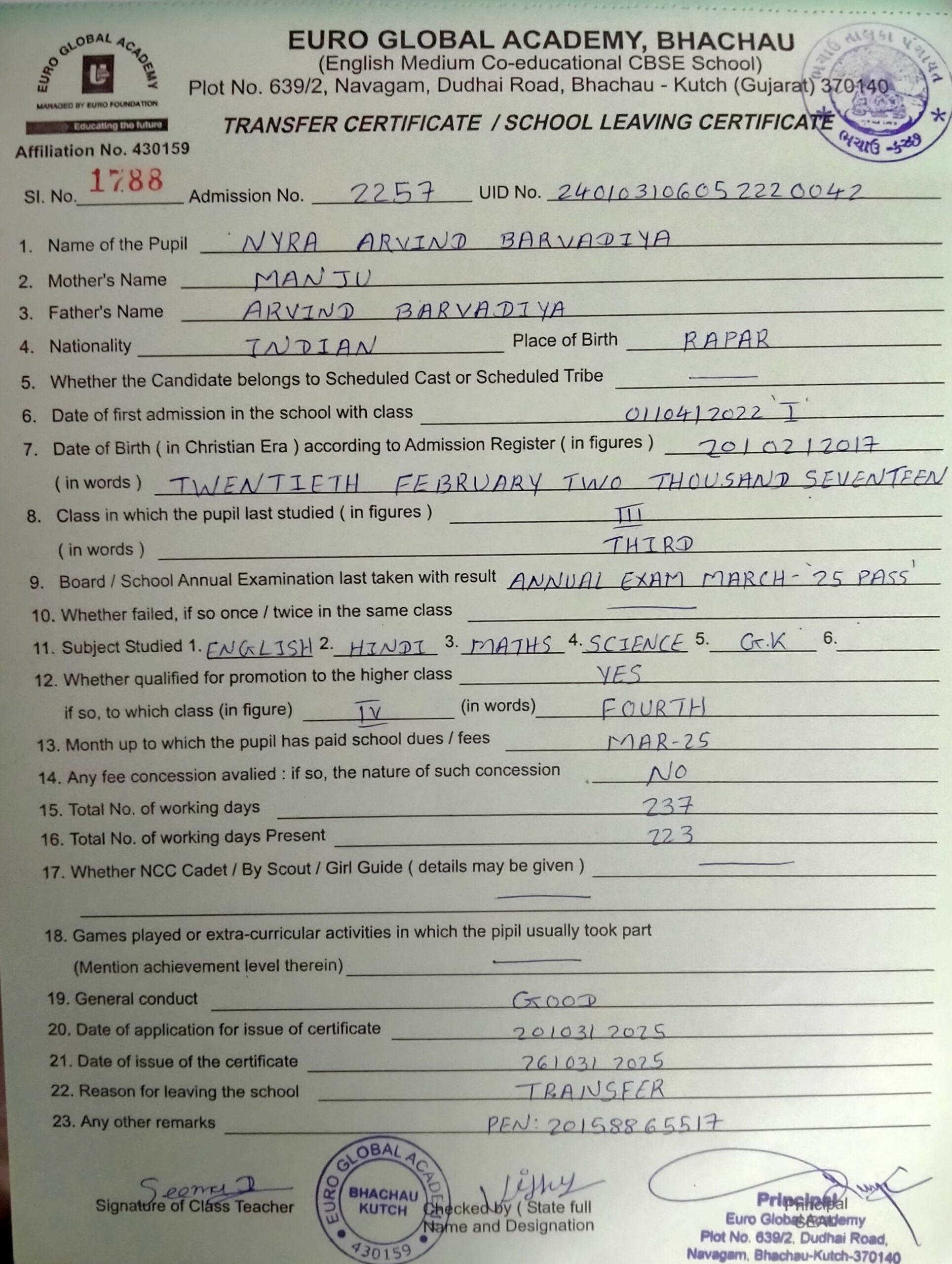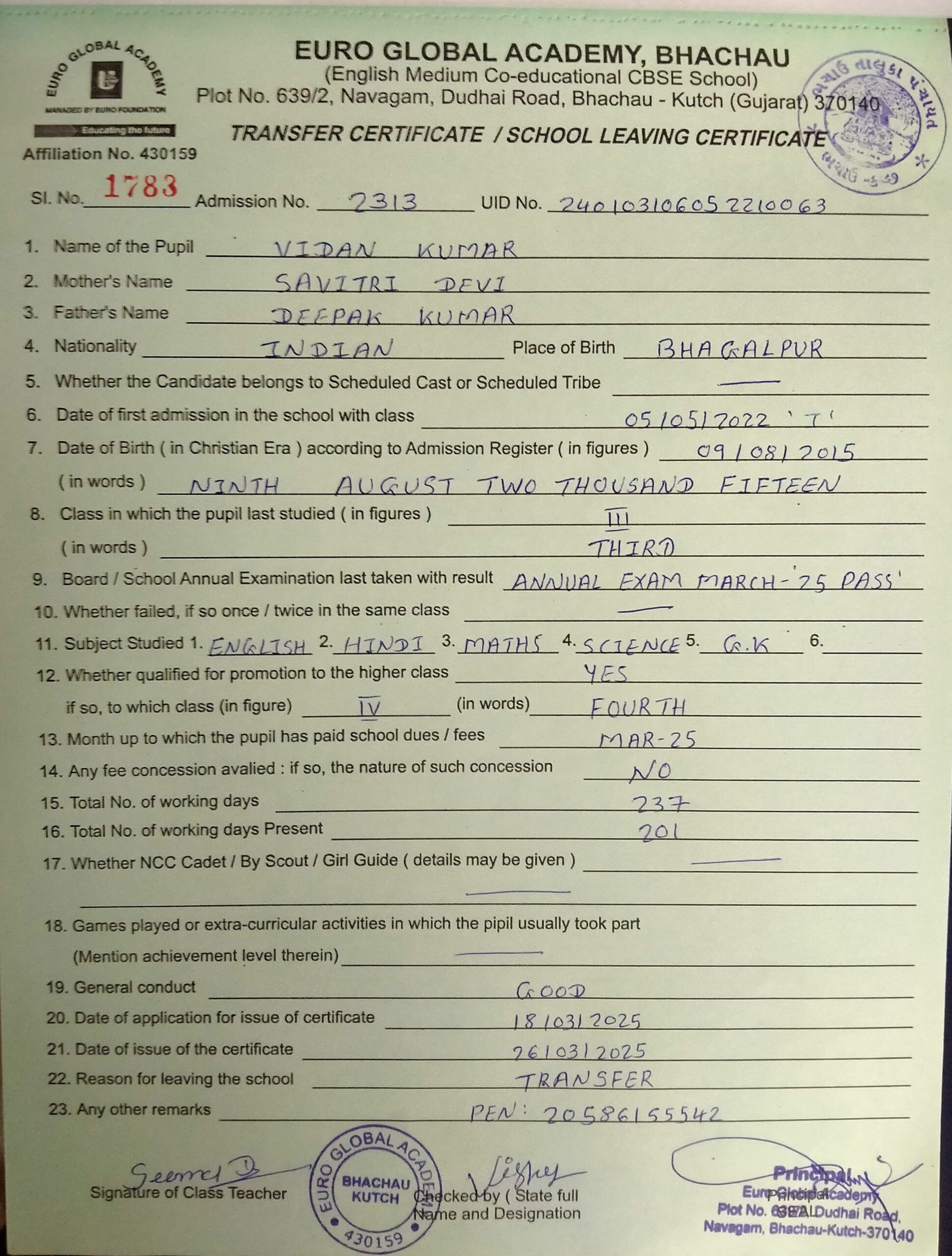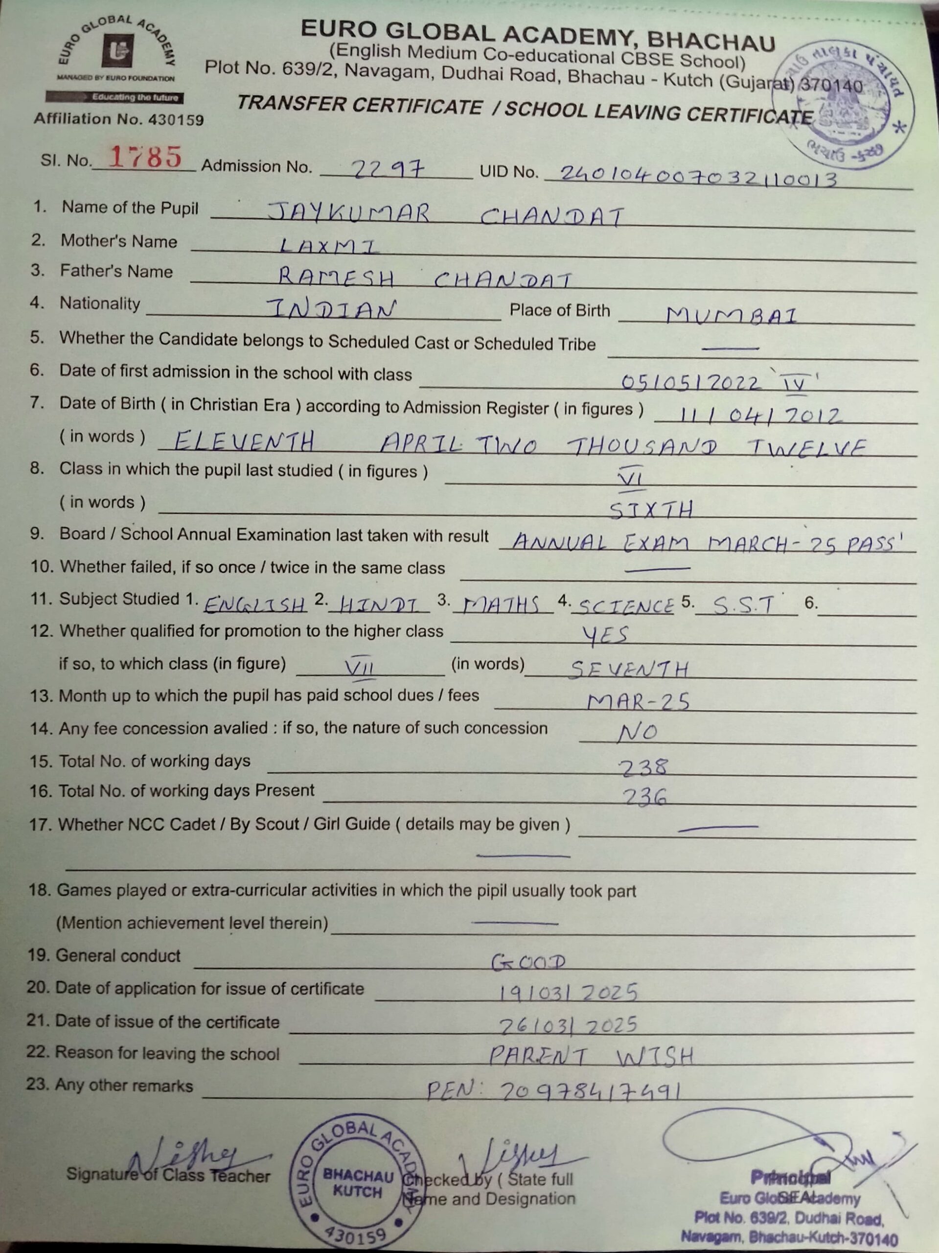 | 1785 | 2297 | JAYKUMAR CHANDAT | VI | 26/03/2025 | VIEW |