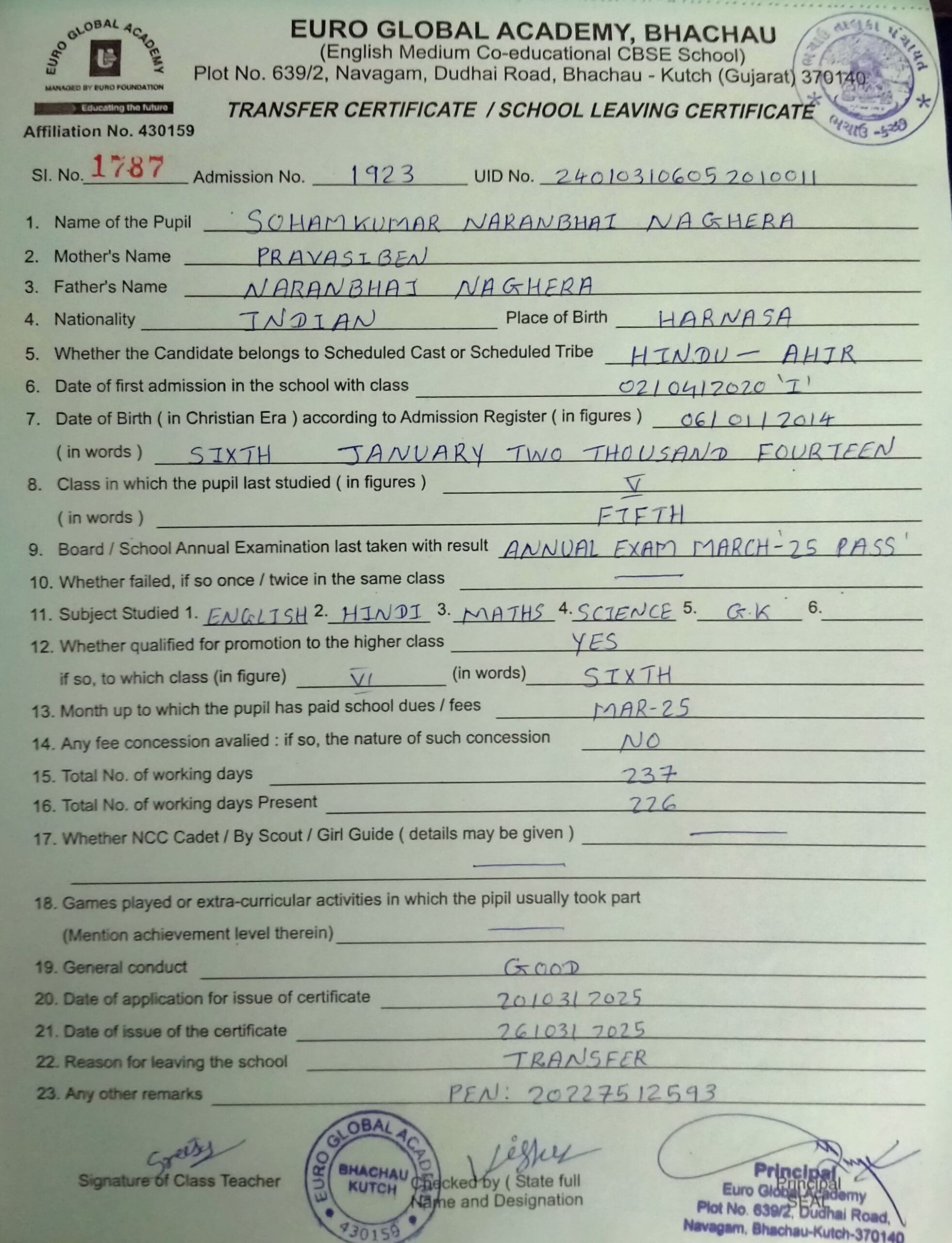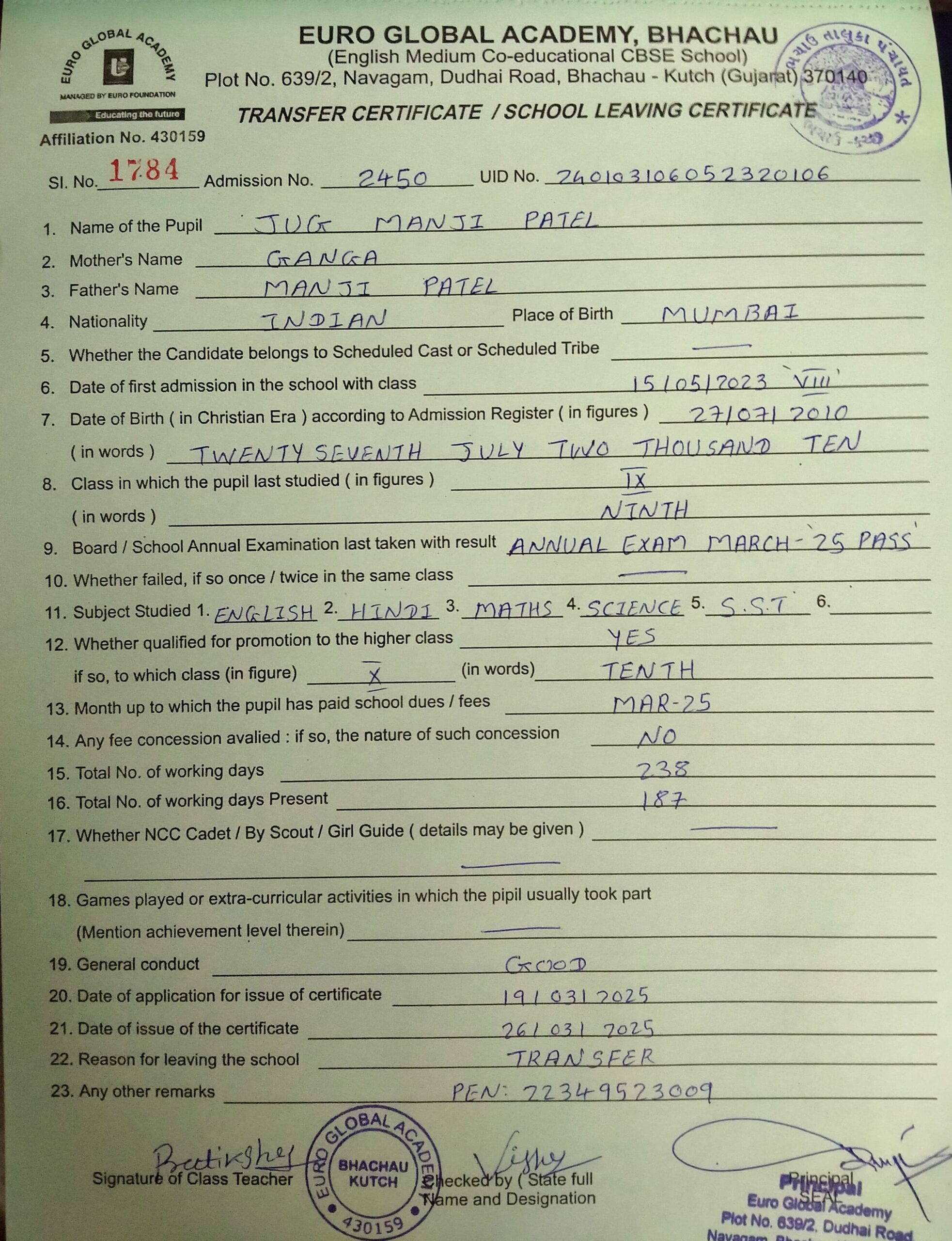 | 1784 | 2450 | JUG MANJI PATEL | IX | 26/03/2025 | VIEW |