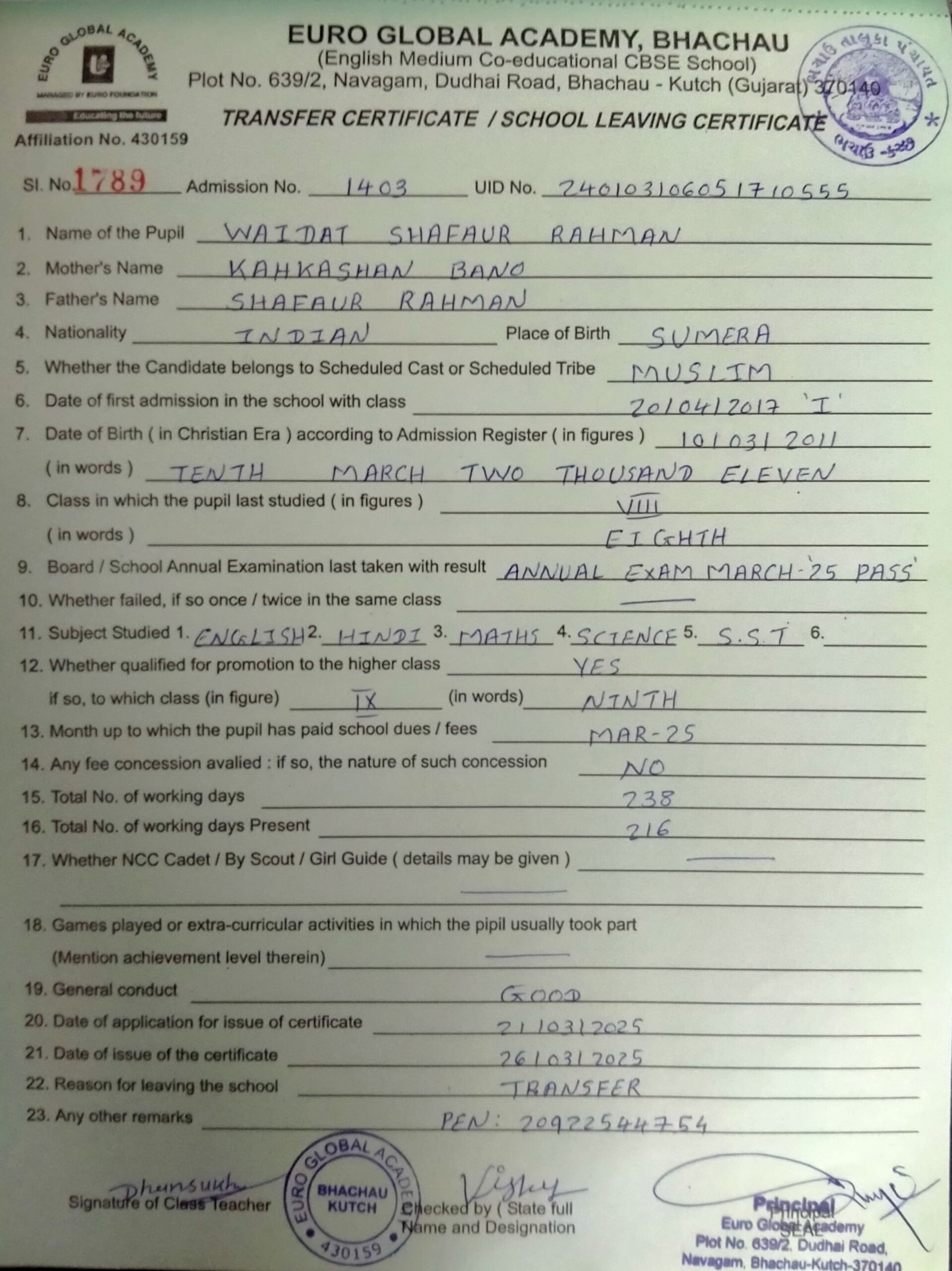 | 1789 | 1403 | WAIDAT SHAFAUR RAHMAN | VIII | 26/03/2025 | VIEW |