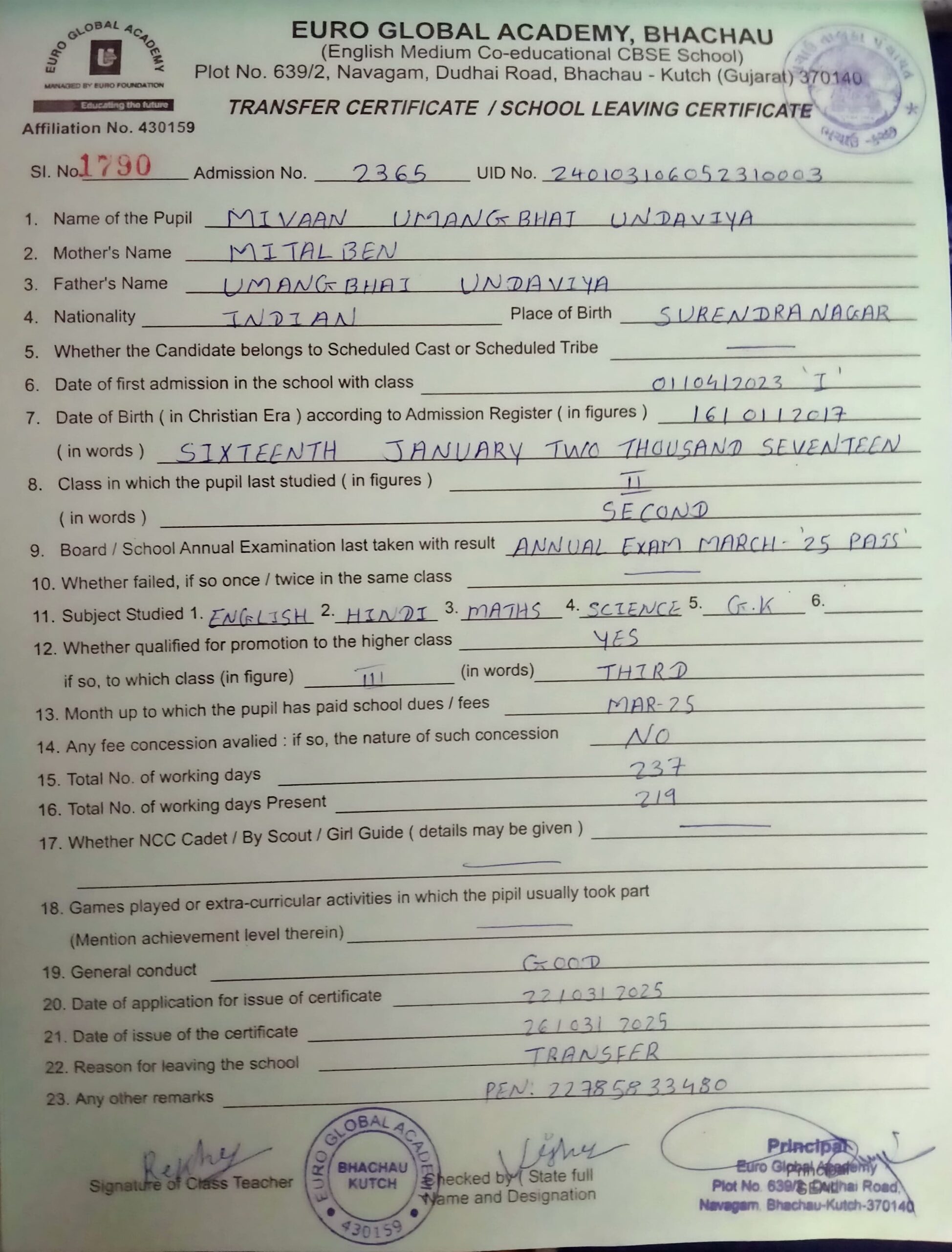 | 1790 | 2365 | MIVAAN UMANGBHAI UNDAVIYA | II | 26/03/2025 | VIEW |