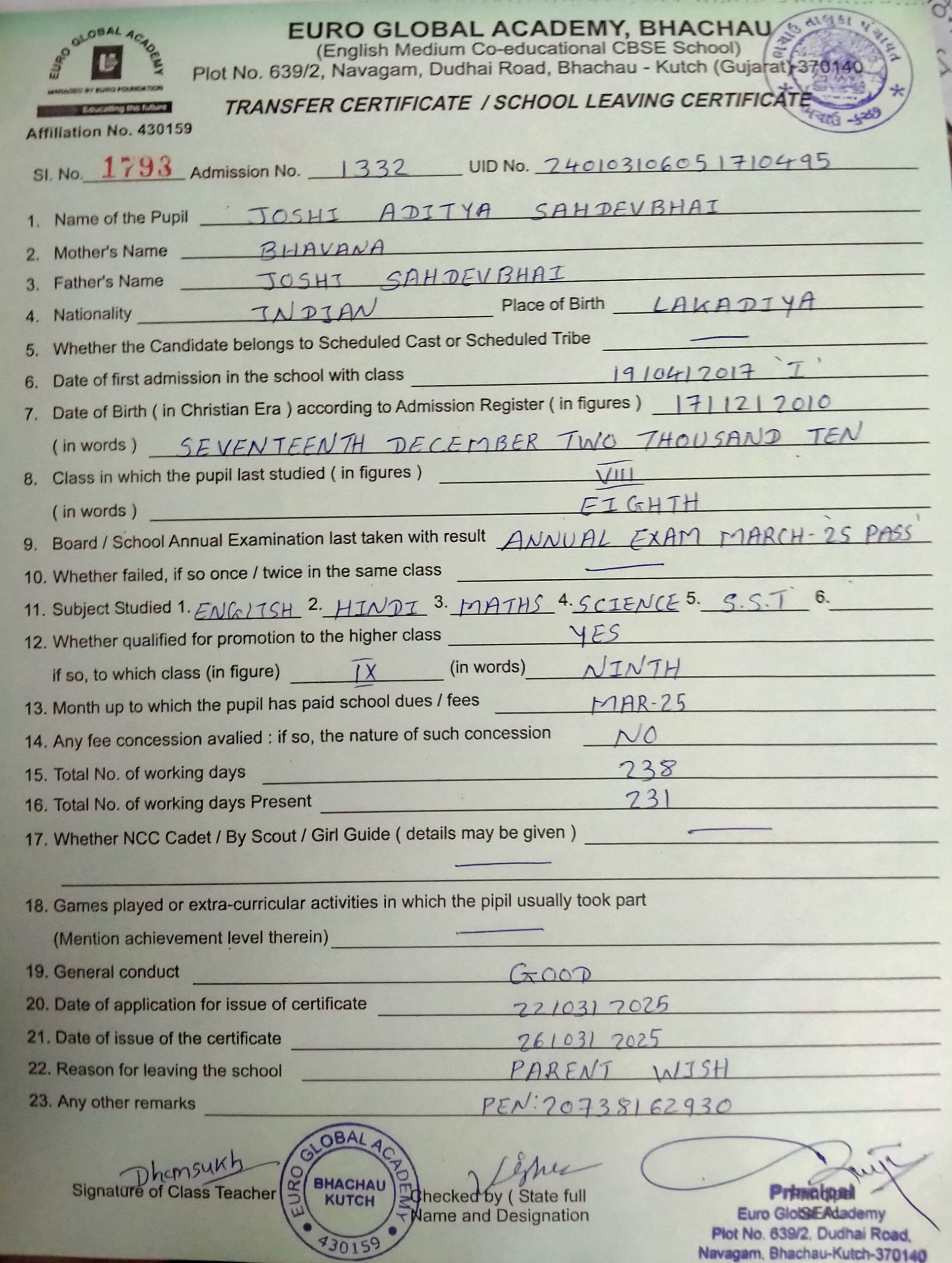 | 1793 | 1332 | JOSHI ADITYA SAHDEVBHAI | VIII | 26/03/2025 | VIEW |