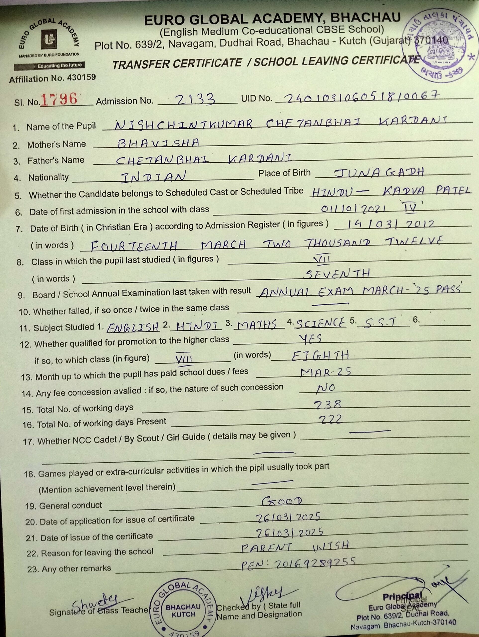 | 1796 | 2133 | NISHCHINTKUMAR C KARDANI | VII | 26/03/2025 | VIEW |