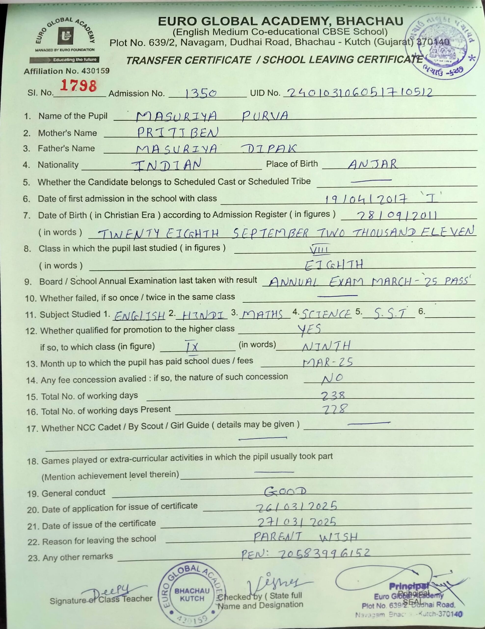 | 1798 | 1350 | MASURIYA PURVA | VIII | 26/03/2025 | VIEW |