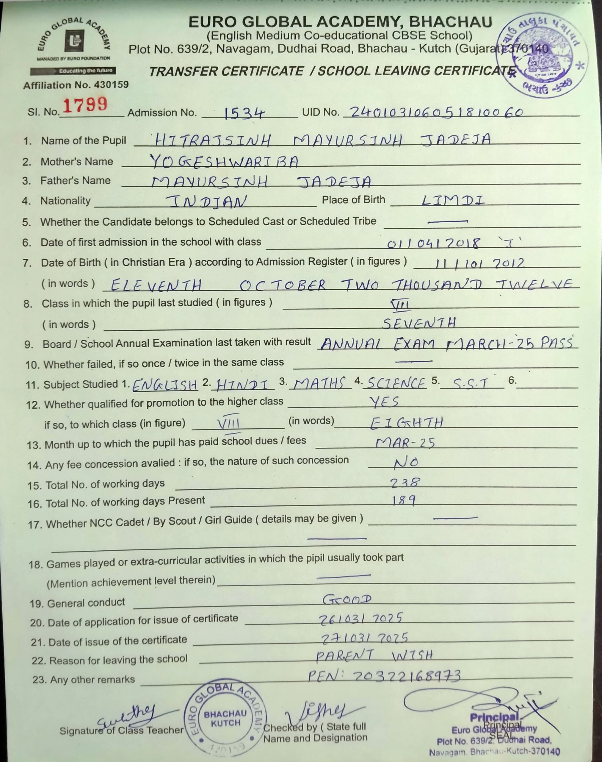 | 1799 | 1534 | HITRAJSINH M JADEJA | VII | 26/03/2025 | VIEW |