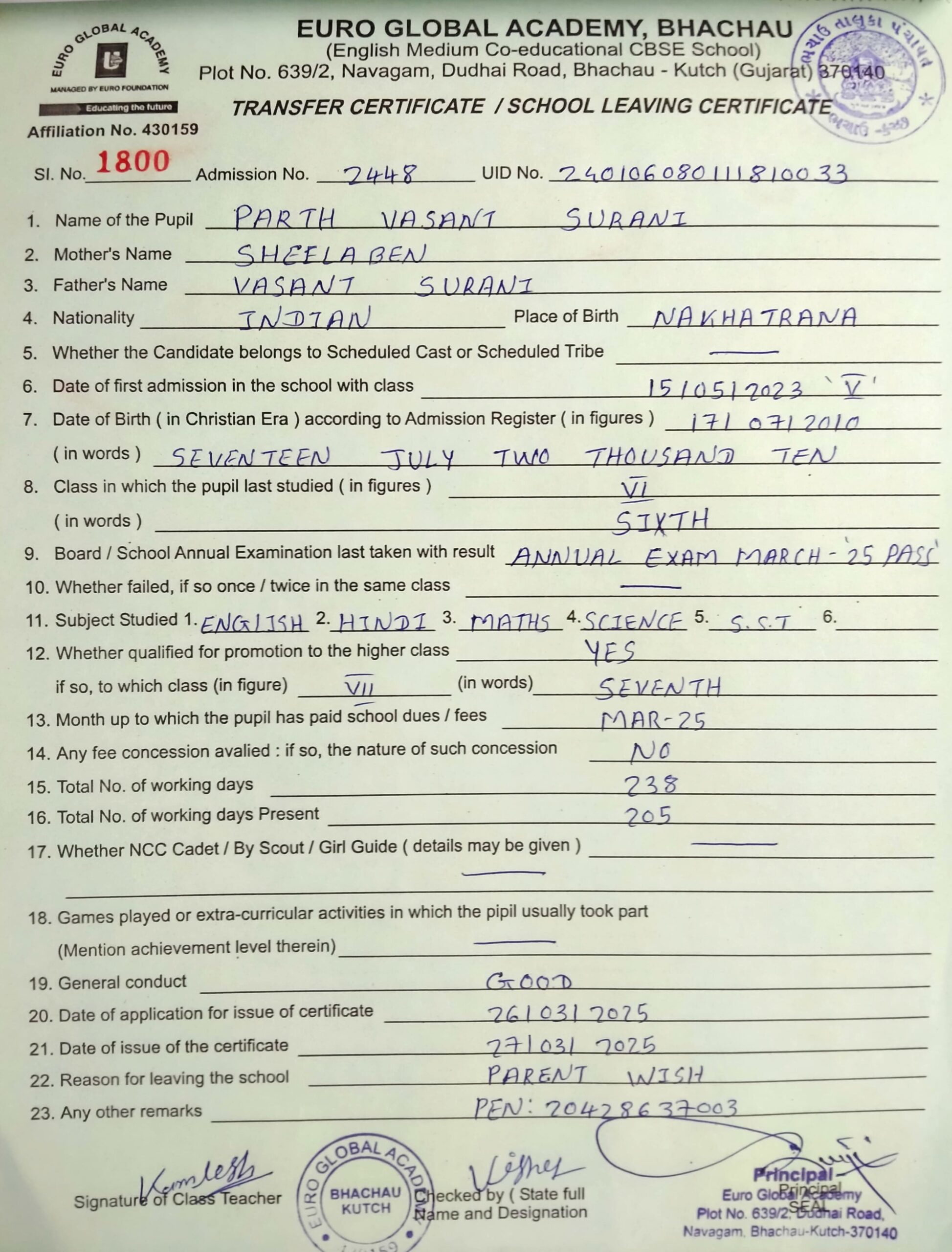 | 1800 | 2448 | PARTH VASANT SURANI | VI | 26/03/2025 | VIEW |